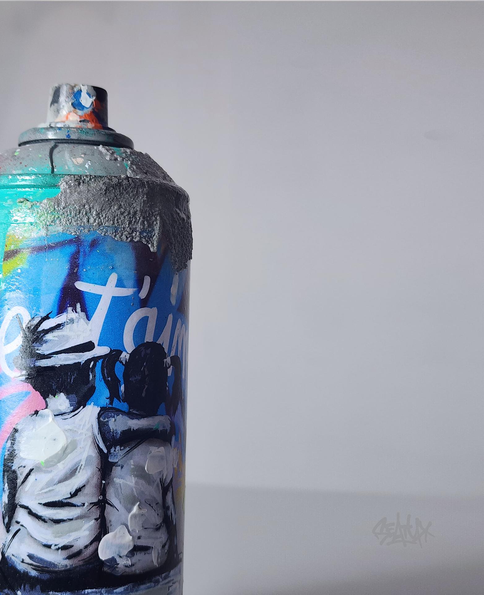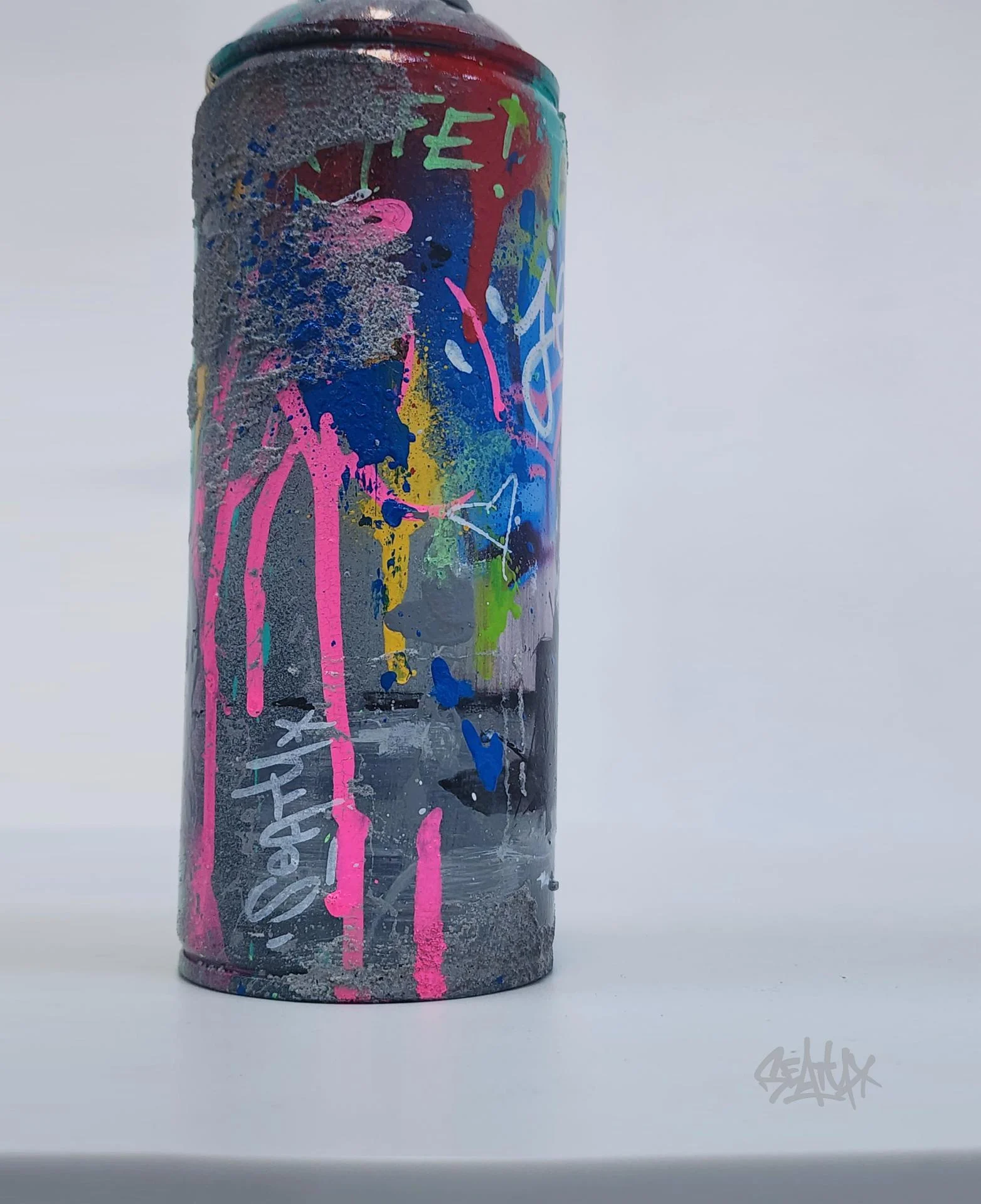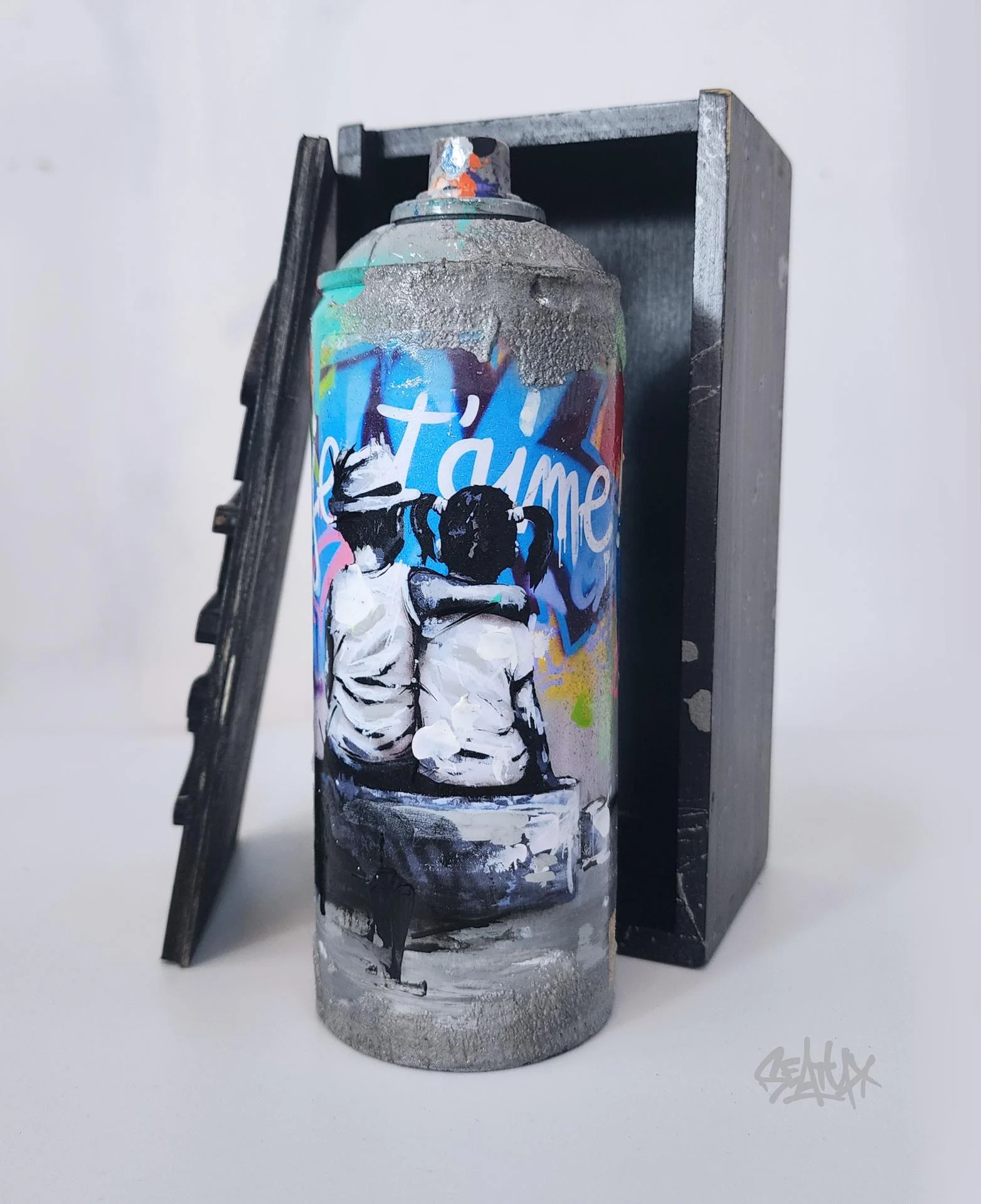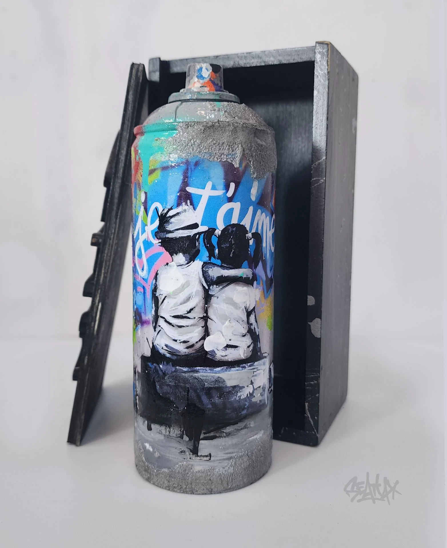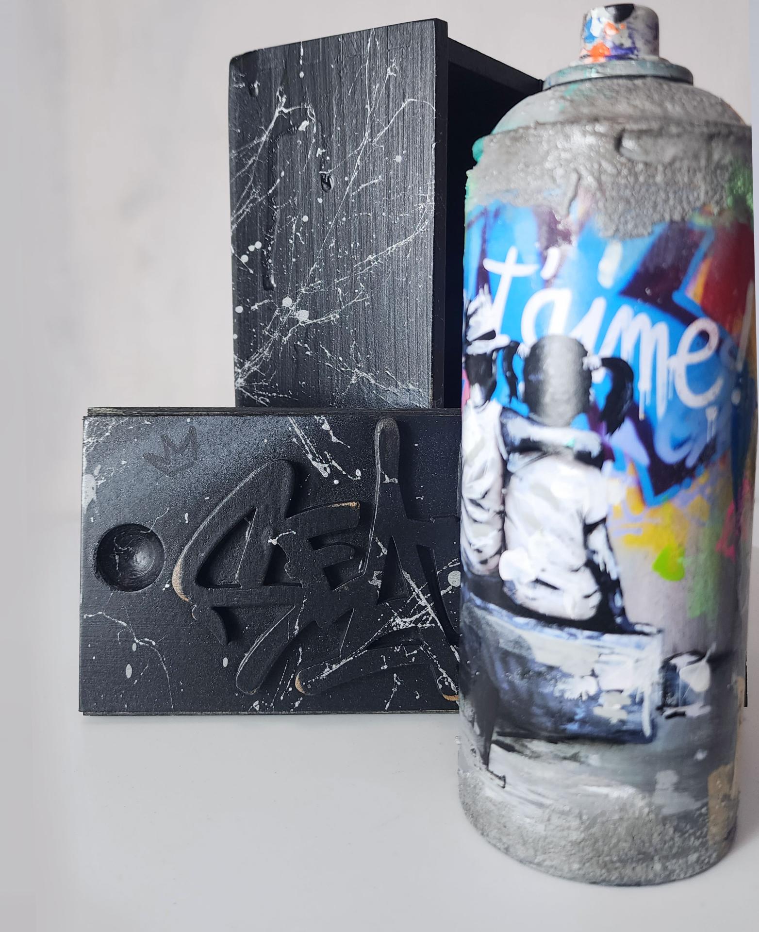 Cette œuvre a été réalisée à partir d’une bombe de peinture usagée, soigneusement transformée en pièce d’art singulière. Une impression a été apposée sur le corps de la bombe, puis rehaussée à la main afin de créer des textures et des nuances exclusives. Chaque exemplaire est donc une pièce unique. L’artiste a intégré du béton et de la feuille d’or, offrant un contraste entre matière brute et éclat précieux. Le tout est protégé par un vernis brillant, garantissant une finition élégante et durable. Cette création allie recyclage, modernité et expression artistique, parfaite pour apporter une touche d’originalité à votre intérieur ou compléter une collection d’art urbain. Chaque création est présentée dans sa boîte en bois “Black Box”, un écrin entièrement peint à la main et unique ! Cette boîte devient elle-même un objet de décoration à part entière, sublimant l’œuvre qu’elle renferme.