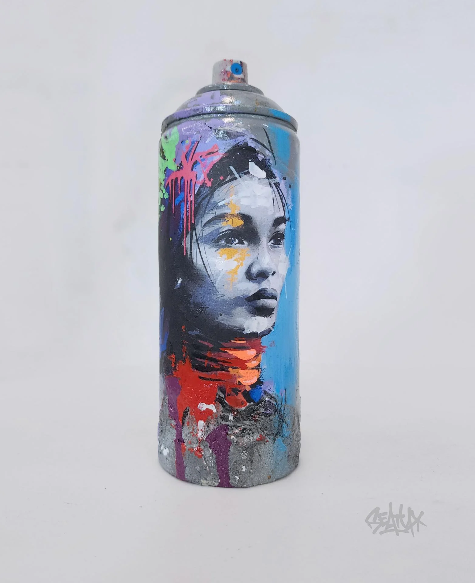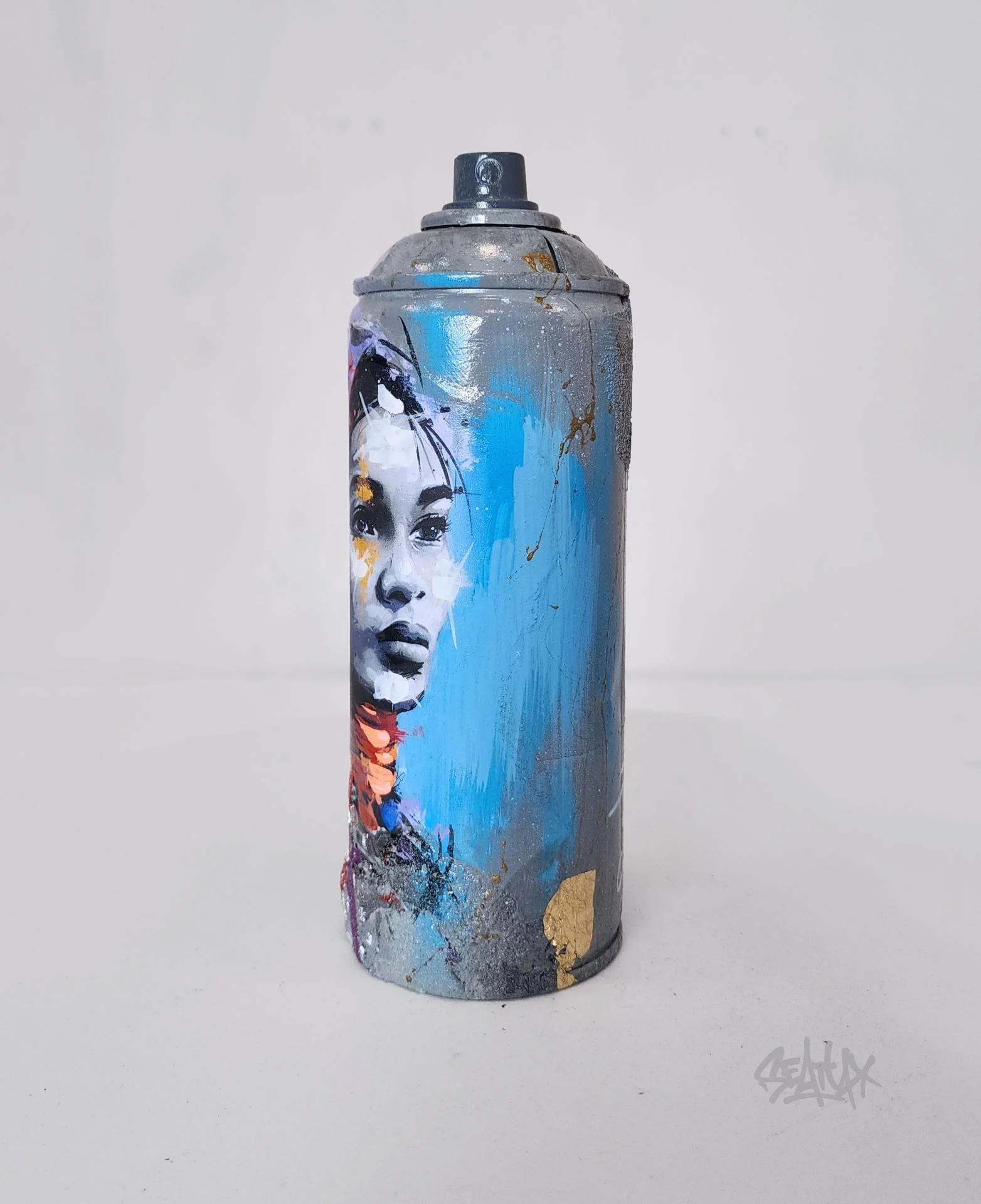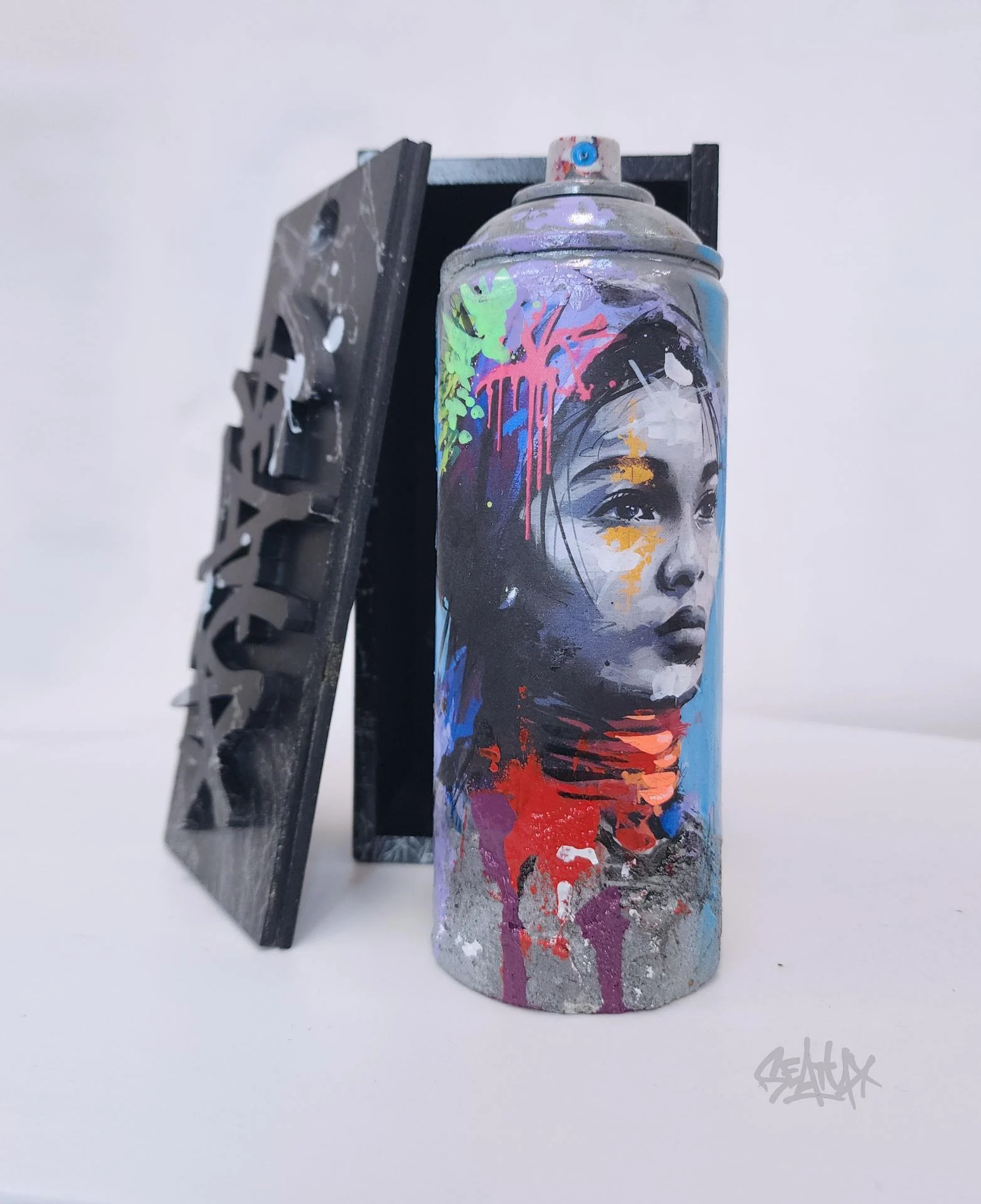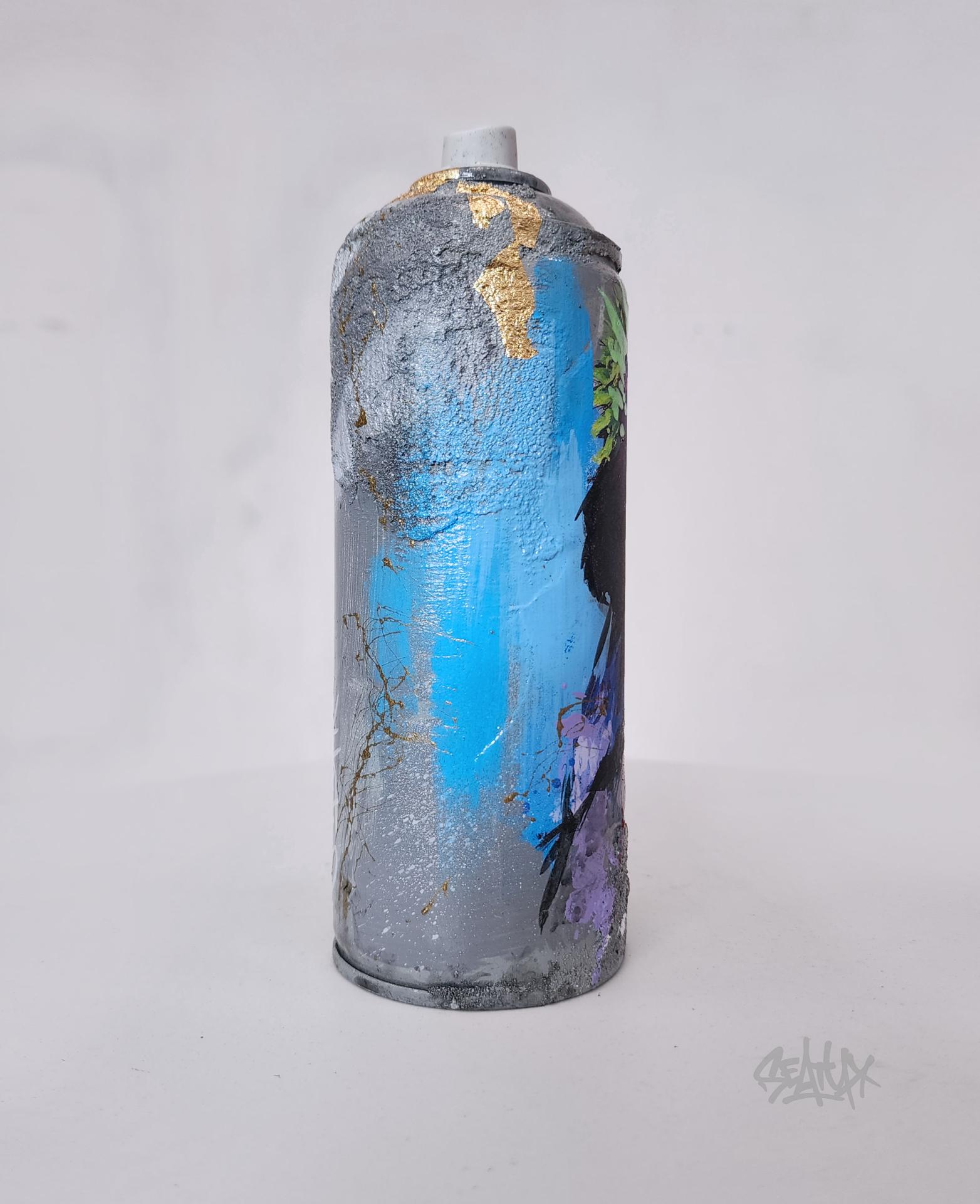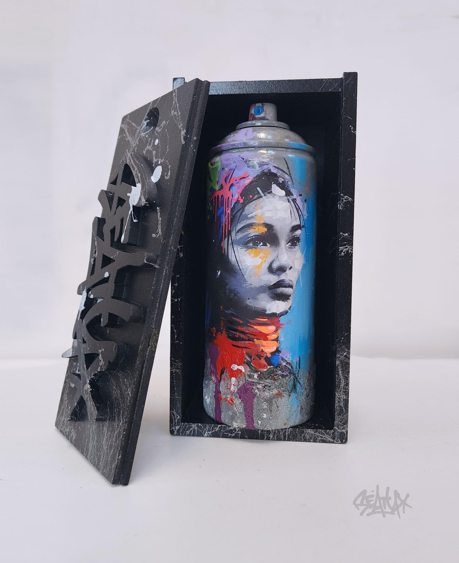 Cette œuvre a été réalisée à partir d’une bombe de peinture usagée, soigneusement transformée en pièce d’art singulière. Une impression a été apposée sur le corps de la bombe, puis rehaussée à la main afin de créer des textures et des nuances exclusives. Chaque exemplaire est donc une pièce unique. L’artiste a intégré du béton et de la feuille d’or, offrant un contraste entre matière brute et éclat précieux. Le tout est protégé par un vernis brillant, garantissant une finition élégante et durable. Cette création allie recyclage, modernité et expression artistique, parfaite pour apporter une touche d’originalité à votre intérieur ou compléter une collection d’art urbain. Chaque création est présentée dans sa boîte en bois “Black Box”, un écrin entièrement peint à la main et unique ! Cette boîte devient elle-même un objet de décoration à part entière, sublimant l’œuvre qu’elle renferme.