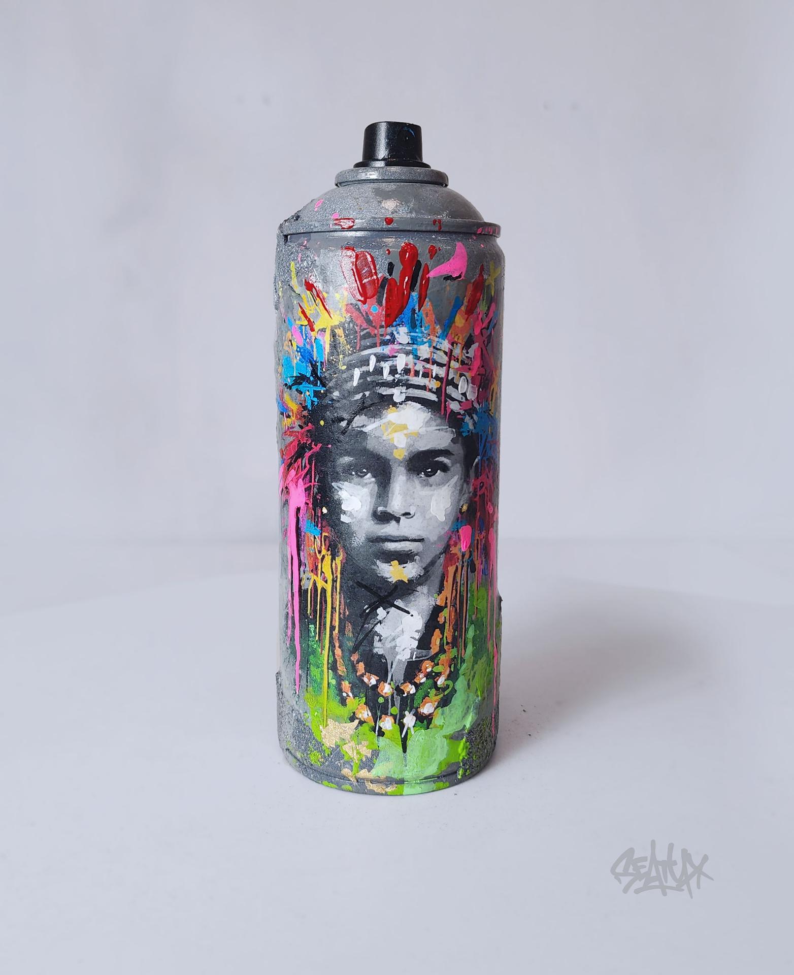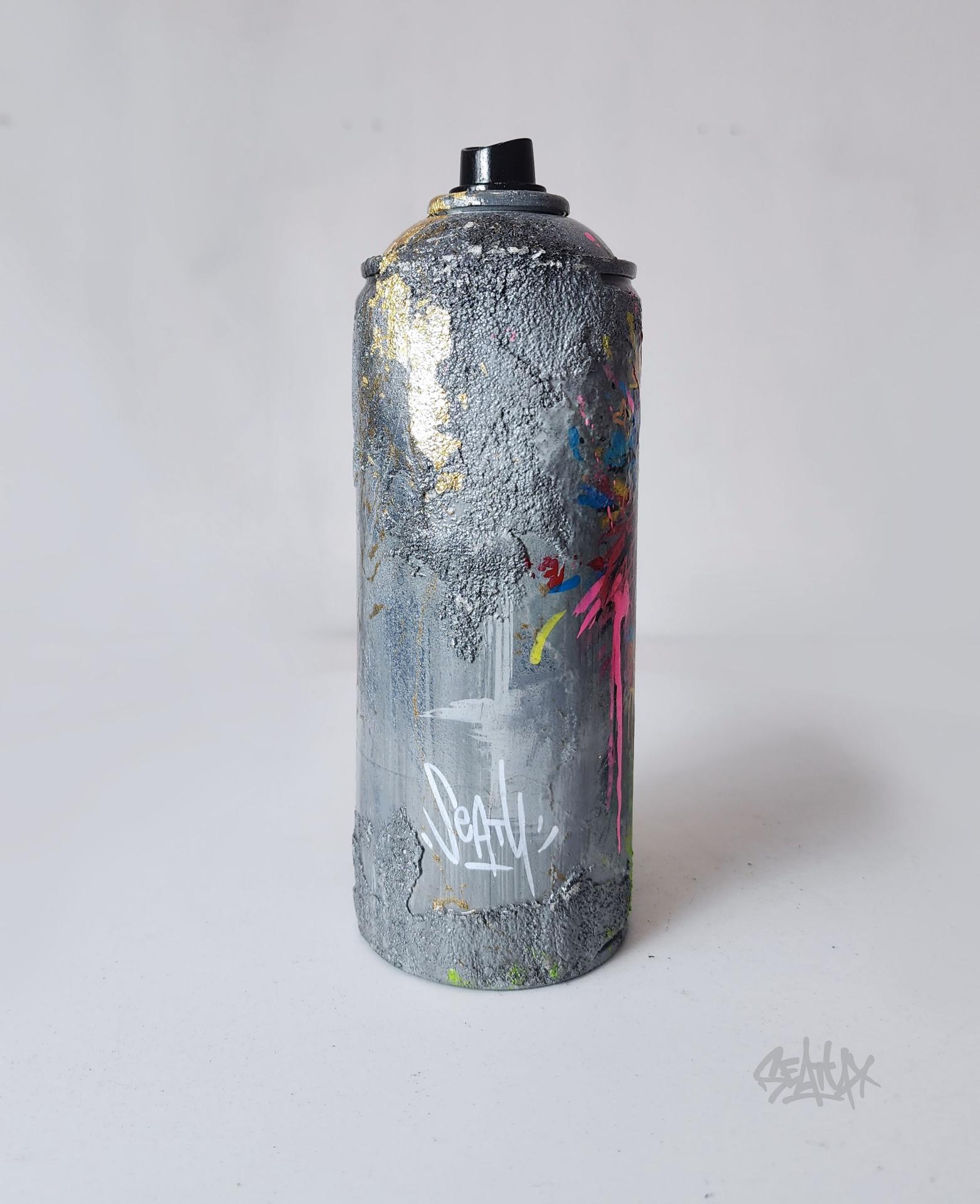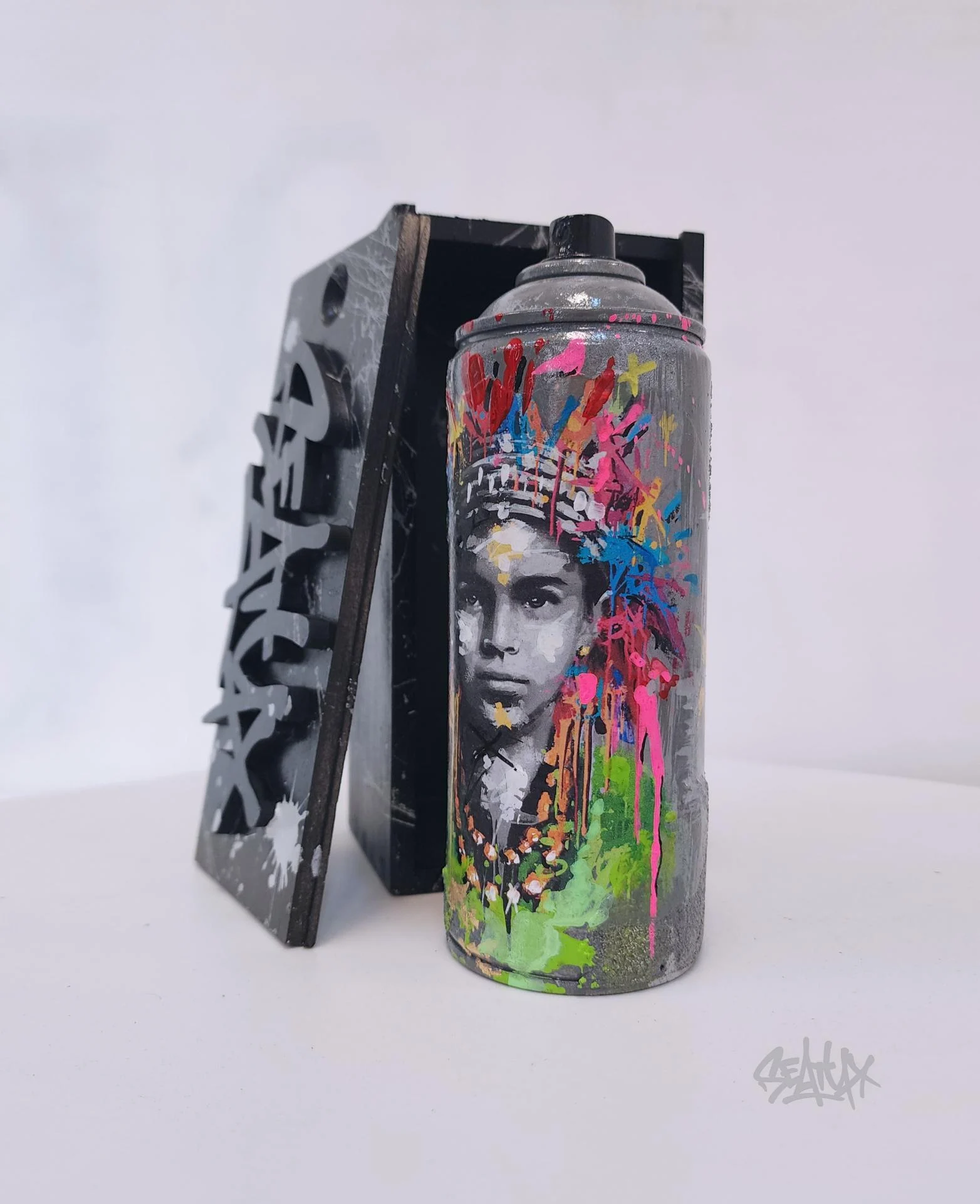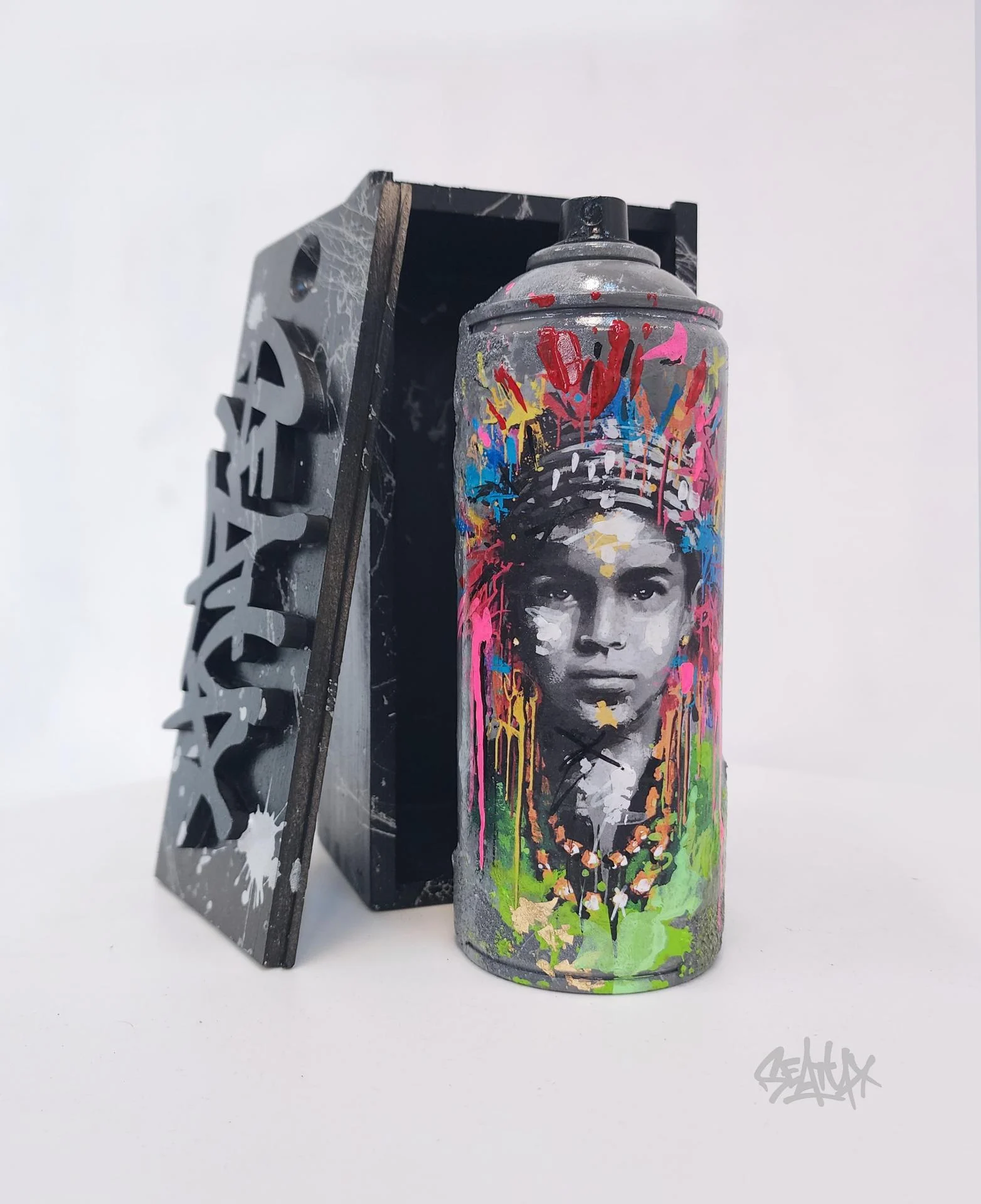 Cette œuvre a été réalisée à partir d’une bombe de peinture usagée, soigneusement transformée en pièce d’art singulière. Une impression a été apposée sur le corps de la bombe, puis rehaussée à la main afin de créer des textures et des nuances exclusives. Chaque exemplaire est donc une pièce unique. L’artiste a intégré du béton et de la feuille d’or, offrant un contraste entre matière brute et éclat précieux. Le tout est protégé par un vernis brillant, garantissant une finition élégante et durable. Cette création allie recyclage, modernité et expression artistique, parfaite pour apporter une touche d’originalité à votre intérieur ou compléter une collection d’art urbain. Chaque création est présentée dans sa boîte en bois “Black Box”, un écrin entièrement peint à la main et unique ! Cette boîte devient elle-même un objet de décoration à part entière, sublimant l’œuvre qu’elle renferme.